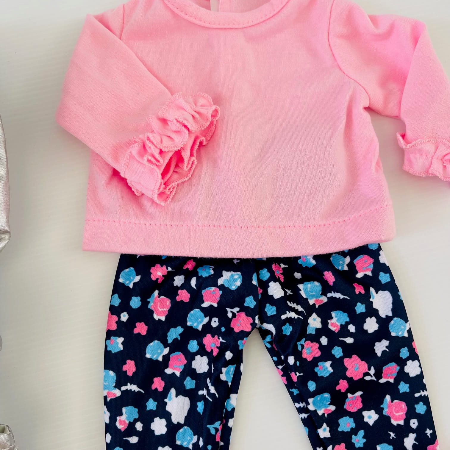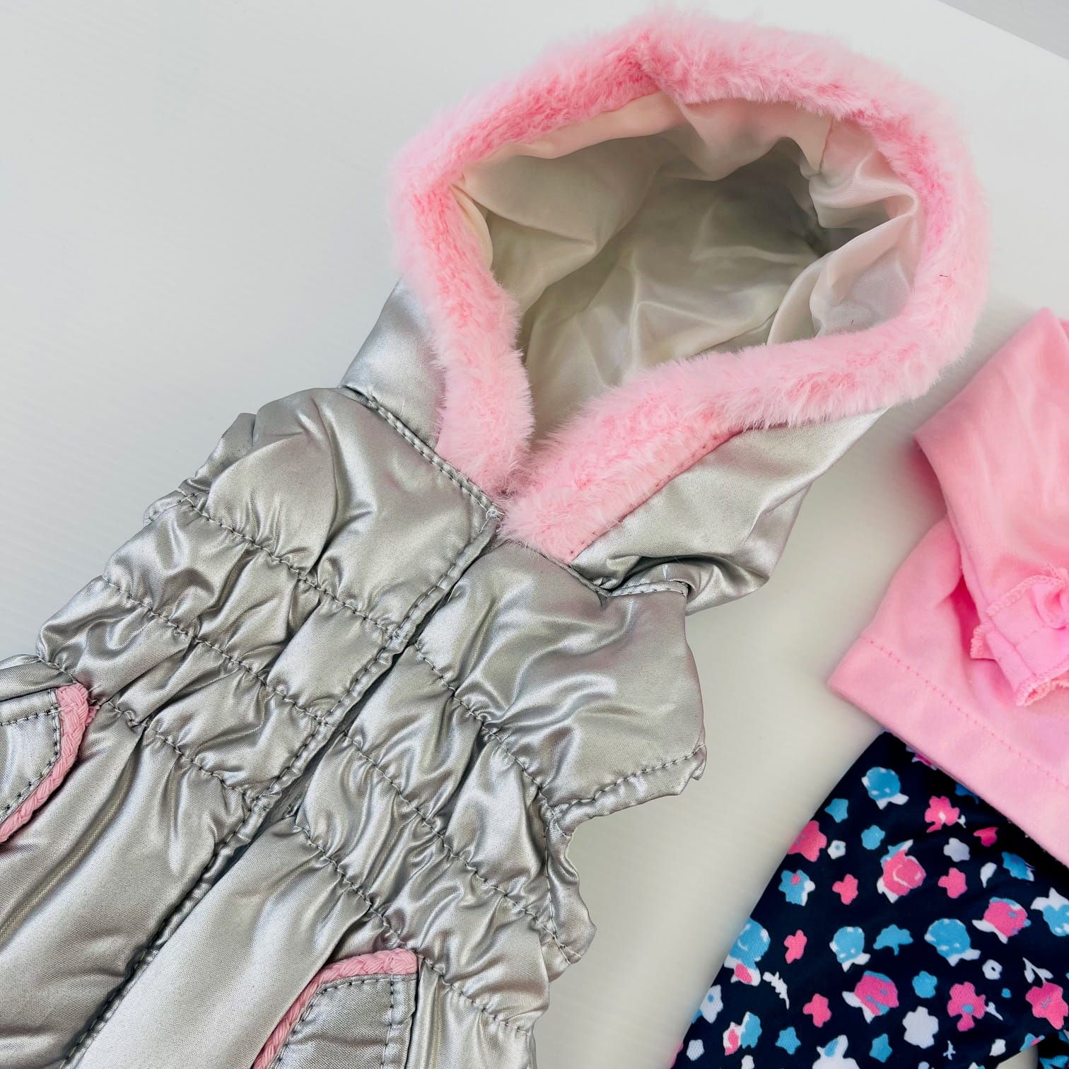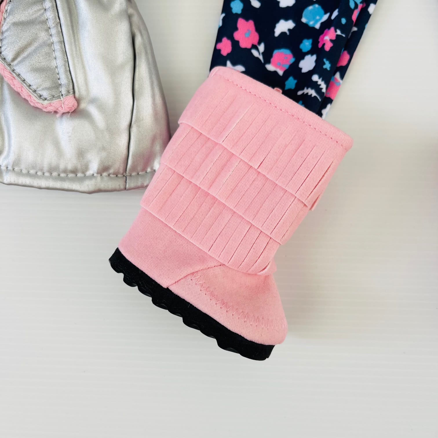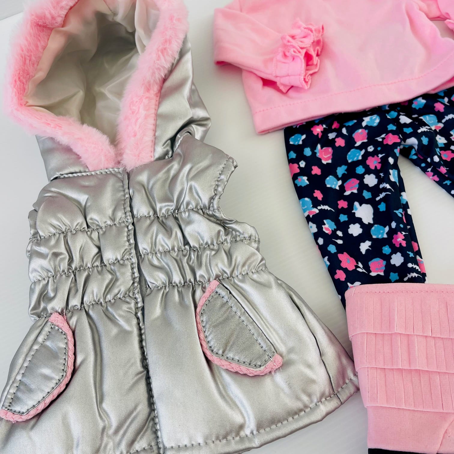This Pink Winter Outfit Set keeps 18″ dolls warm and stylish on chilly days. Featuring a soft long-sleeve pink top, floral leggings, snug pink fringe boots, and a silver puffer vest with fluffy hood trim, this set is perfect for frosty adventures and cosy playtime. Practical comfort with a sweet, stylish twist.