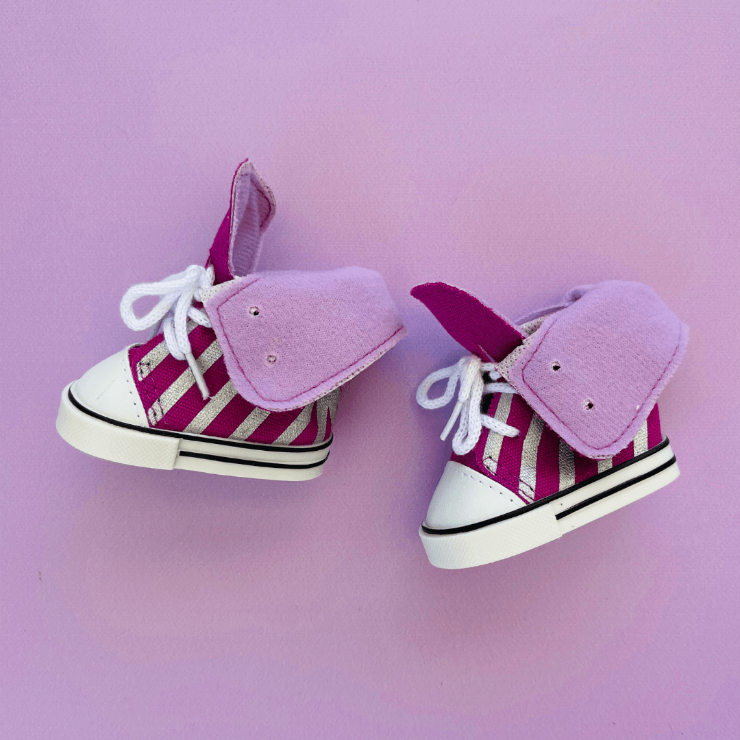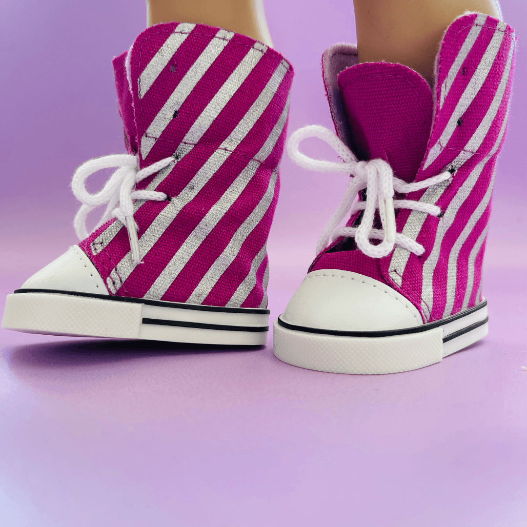 These Purple High Top Sneakers are made for stylish 18″ dolls who love to stand out. With their classic high-top shape and fun purple colour, they’re perfect for everyday adventures, dance-offs, and playtime strolls. Easy to slip on and oh-so-cute, these sneakers are a must-have for mixing, matching, and expressing your doll’s unique style.