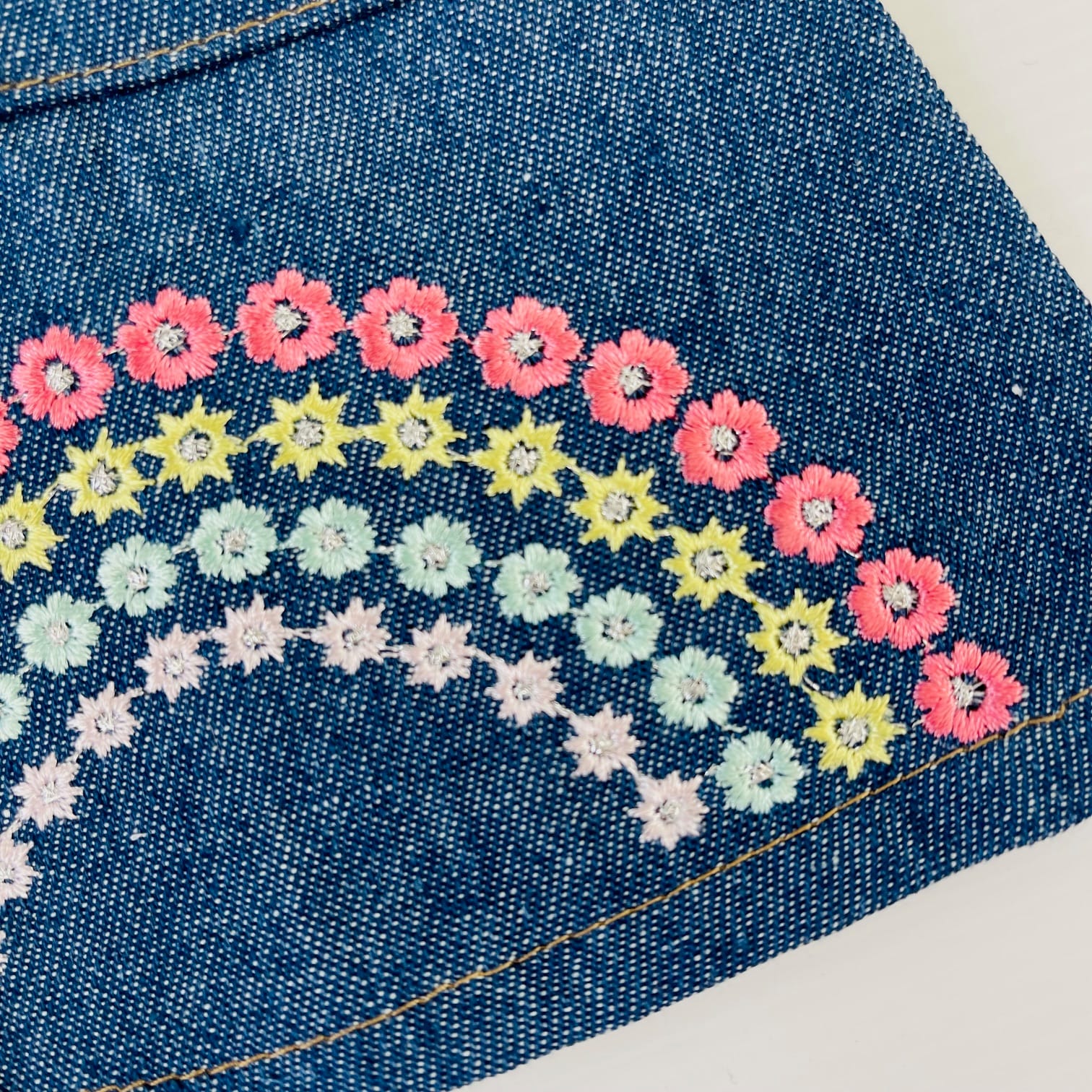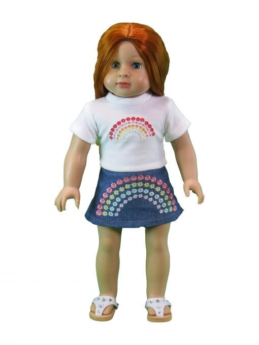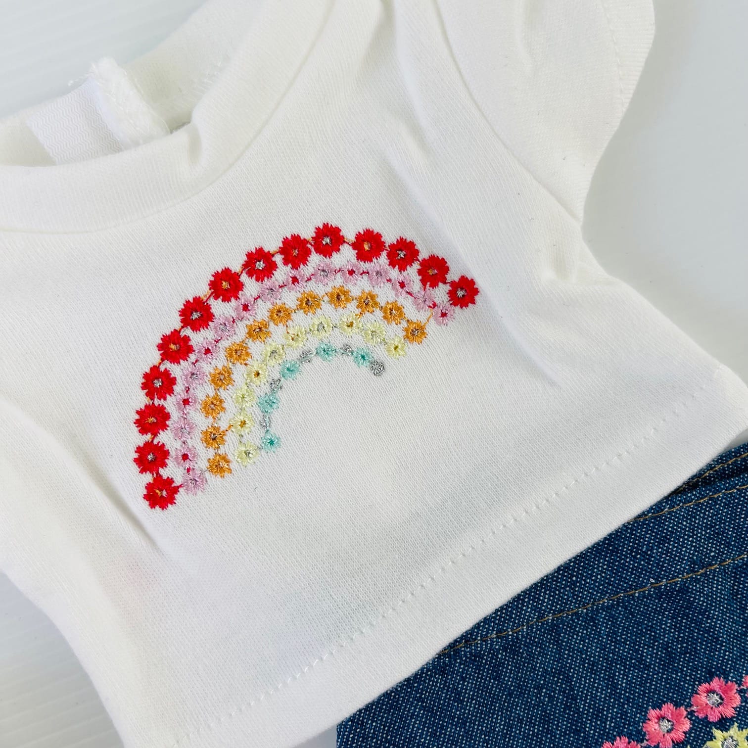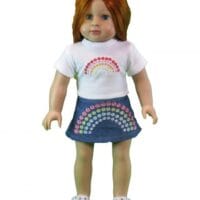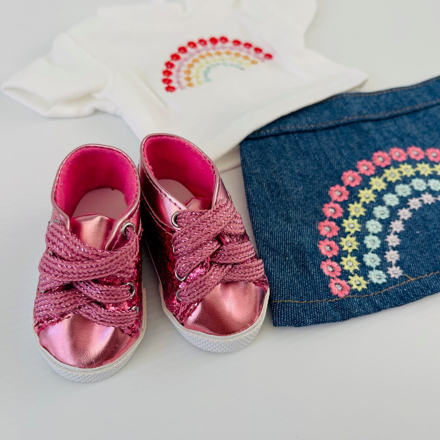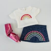 This Rainbow Denim Outfit Set is a happy, everyday look for 18″ dolls. Featuring a sweet white tee with embroidered rainbow detail, a denim skirt with a matching rainbow design, and sparkly pink sneakers, this set is perfect for sunny playdays and feel-good adventures. Fun, comfy, and bursting with personality.