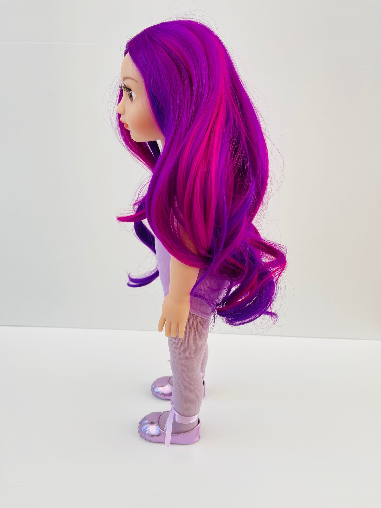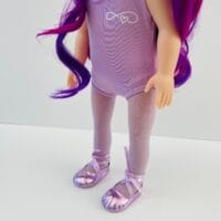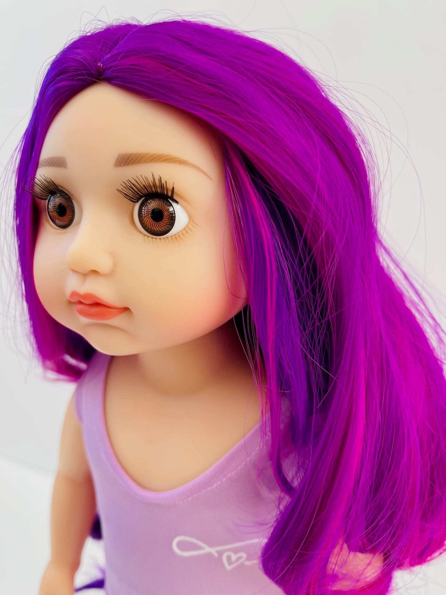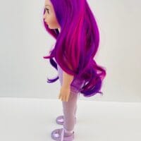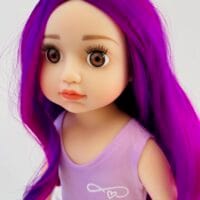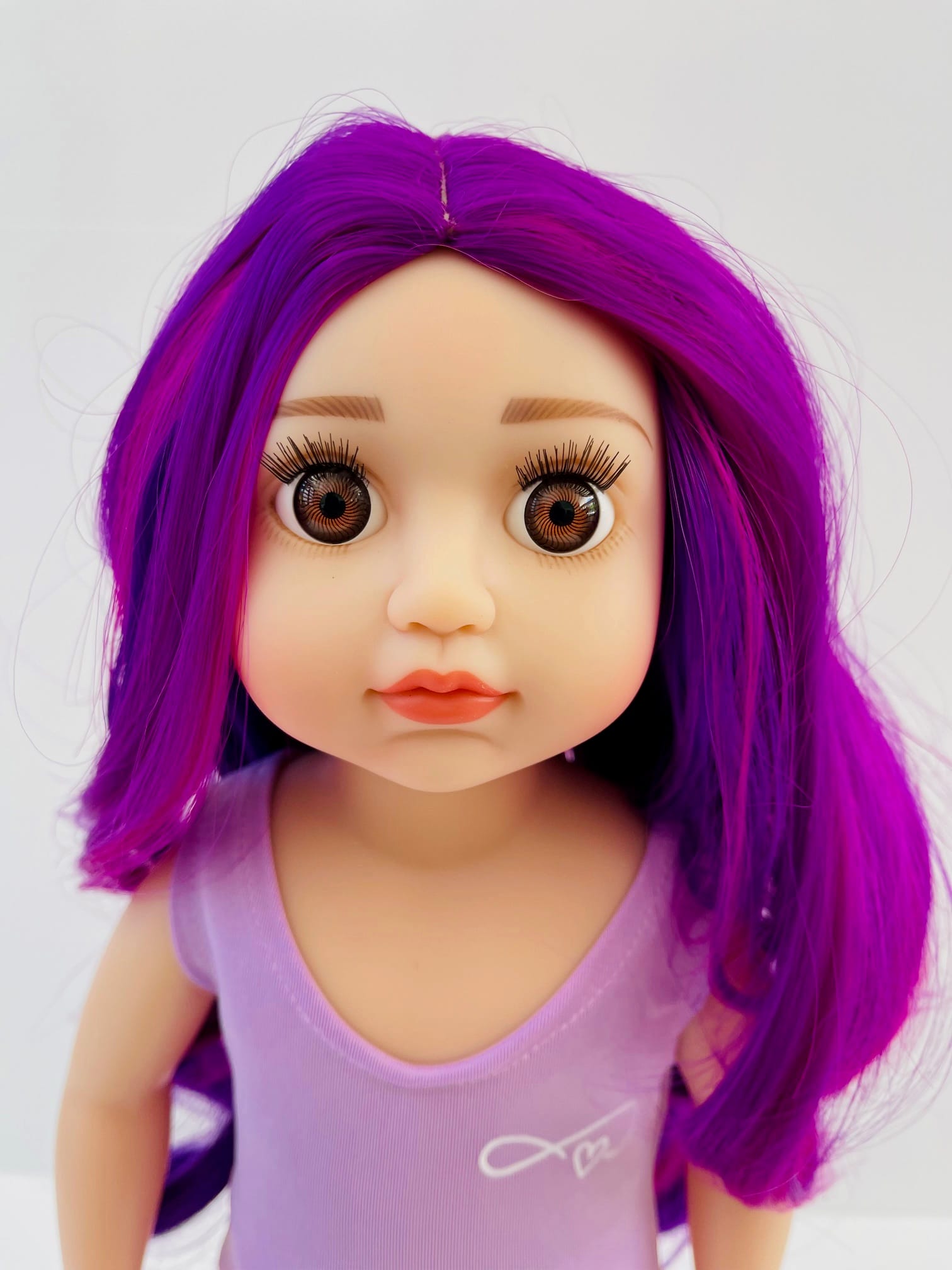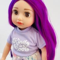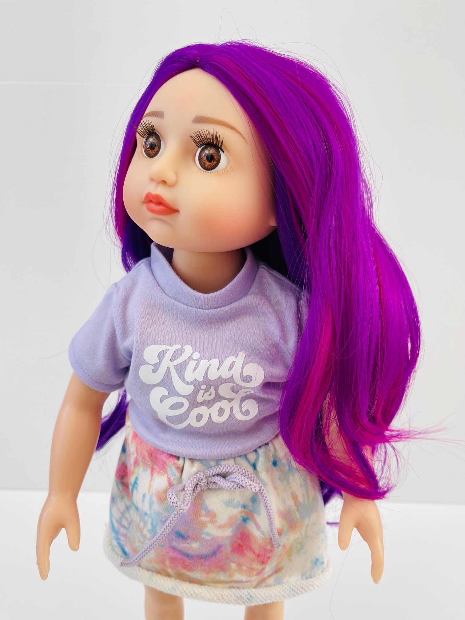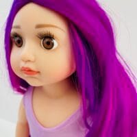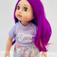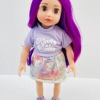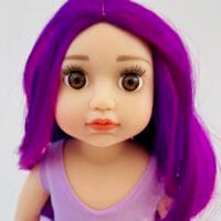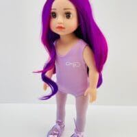 Sophie has gorgeous chocolate brown eyes and delightful mix of vibrant purple hair! She comes wearing her ballet outfit plus her comfy skirt and printed tee for after practice.