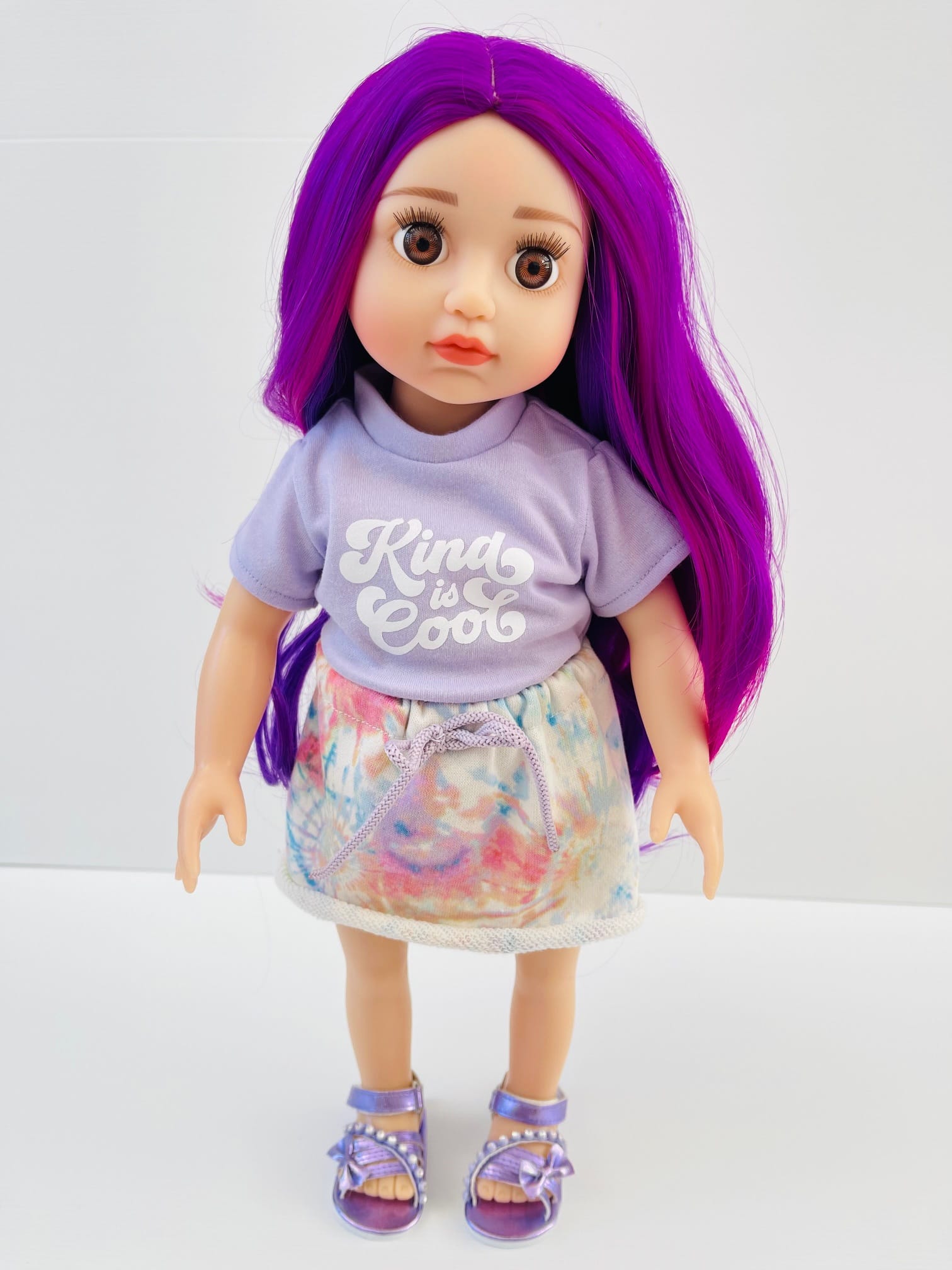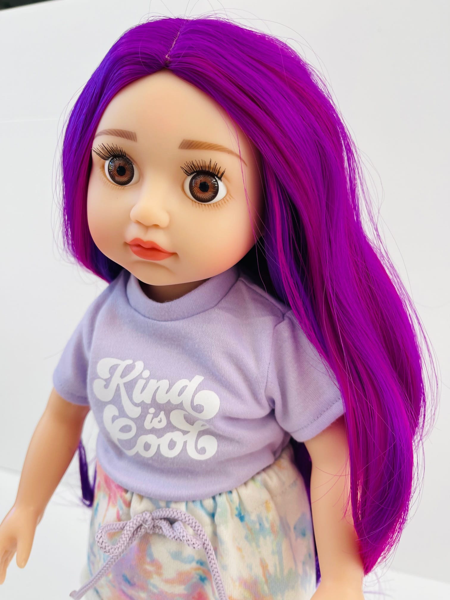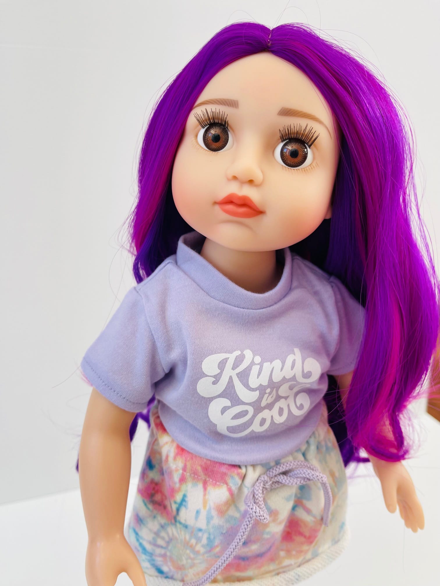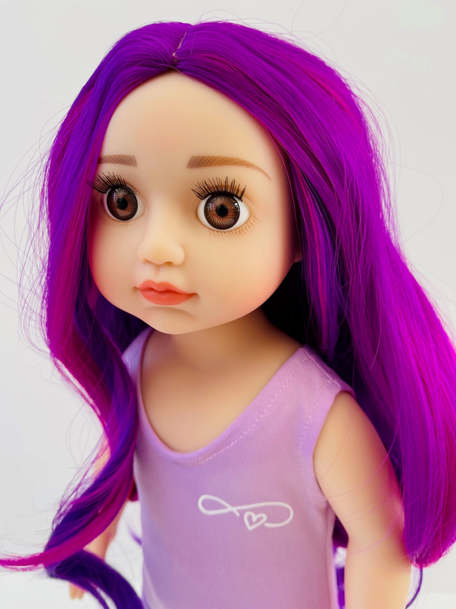 Sophie has gorgeous chocolate brown eyes and delightful mix of vibrant purple hair! She comes wearing her ballet outfit plus her comfy skirt and printed tee for after practice.