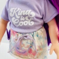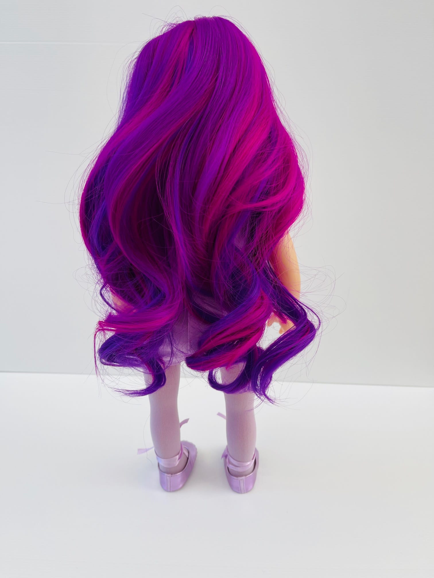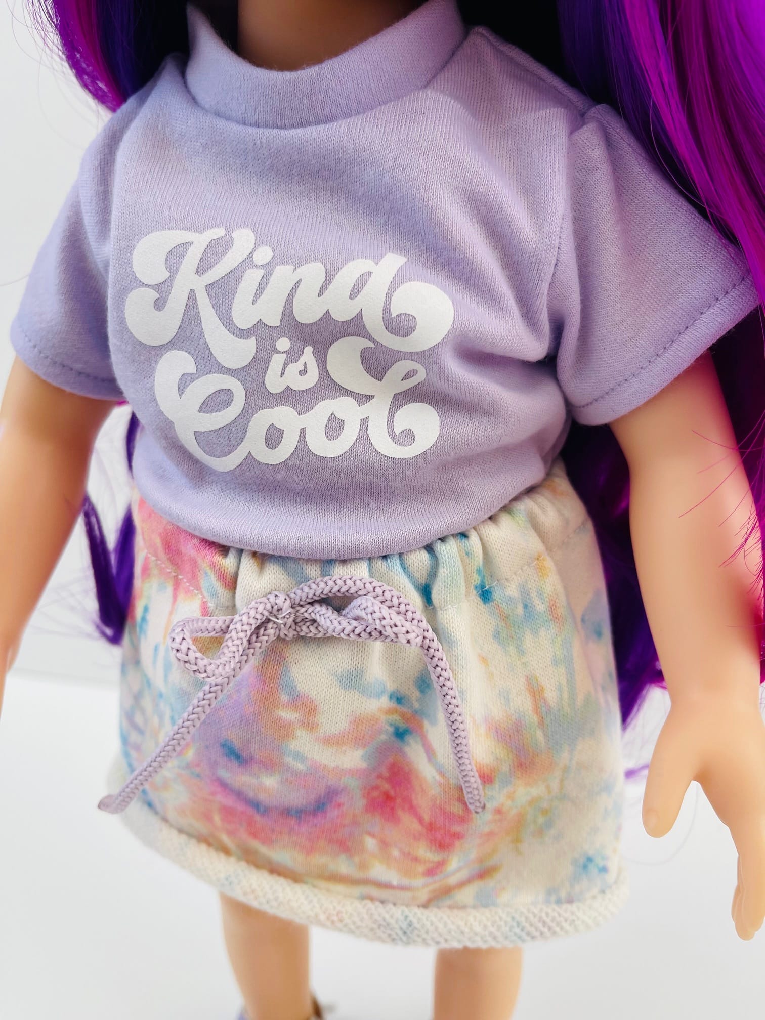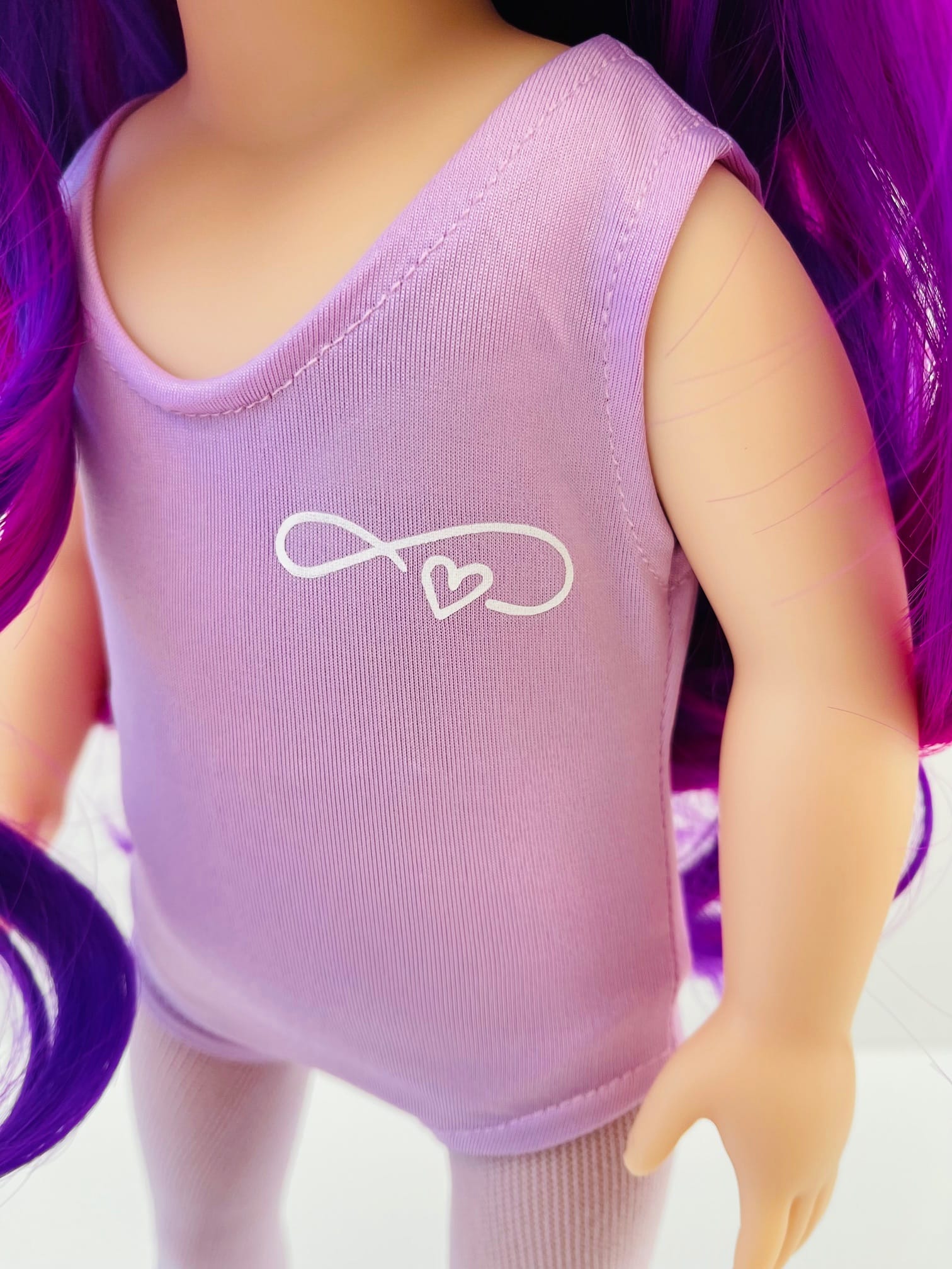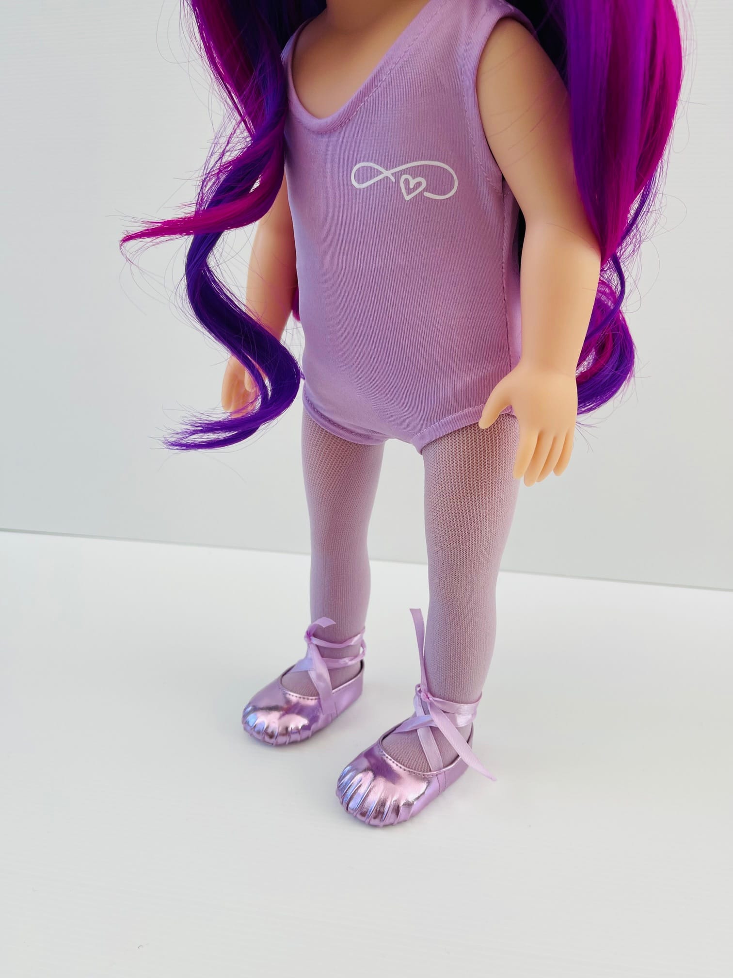 Sophie has gorgeous chocolate brown eyes and delightful mix of vibrant purple hair! She comes wearing her ballet outfit plus her comfy skirt and printed tee for after practice.